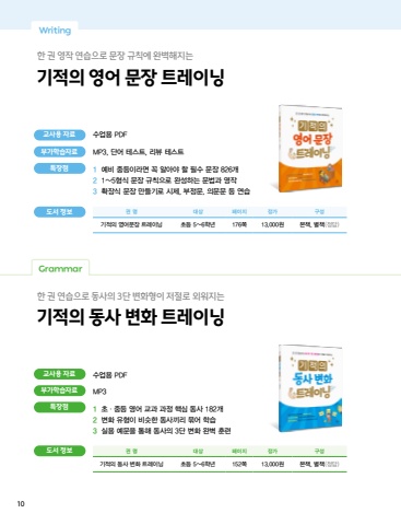 10한 권 영작 연습으로 문장 규칙에 완벽해지는수업용 PDFMP3, 단어 테스트, 리뷰 테스트1 예비 중등이라면 꼭 알아야 할 필수 문장 826개2 1~5형식 문장 규칙으로 완성하는 문법과 영작3 확장식 문장 만들기로 시제, 부정문, 의문문 등 연습기적의 영어 문장 트레이닝WritingGrammar권 명 대상 페이지 정가 구성기적의 영어문장 트레이닝 초등 5~6학년 176쪽 13,000원 본책, 별책(정답)한 권 연습으로 동사의 3단 변화형이 저절로 외워지는수업용 PDFMP31 초 · 중등 영어 교과 과정 핵심 동사 182개2 변화 유형이 비슷한 동사끼리 묶어 학습3 실용 예문을 통해 동사의 3단 변화 완벽 훈련기적의 동사 변화 트레이닝권 명 대상 페이지 정가 구성기적의 동사 변화 트레이닝 초등 5~6학년 152쪽 13,000원 본책, 별책(정답)교사용 자료교사용 자료부가학습자료부가학습자료특장점특장점도서 정보도서 정보