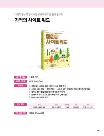 13초등학생이 꼭 알아야 할 사이트 워드 한 권에 끝내기수업용 PDFMP3, Word Card기적의 파닉스 리딩1 초등 필수 사이트 워드 160개, 20일 집중 완성2 사이트 워드 학습 → 문제 확인 → 스토리 읽기 연습으로 이어지는 3단계 학습3 챈트로 철자·발음·뜻을 쉽고 재미있게 익히기4 문제와 스토리 읽기로 단어 쓰임까지 완벽 학습5 QR코드로 편리한 학습기적의 사이트 워드단계 대상 페이지 정가 구성기적의 사이트 워드 초등 1~2학년 184쪽 15,000원 본책(정답 포함)교사용 자료부가학습자료후속 교재 추천특장점도서 정보