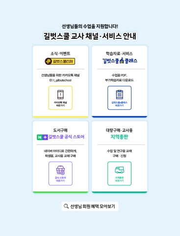 소식·이벤트도서구매선생님들을 위한 카카오톡 채널ID: t_gilbutschool네이버 아이디로 간편하게,학생용, 교사용 교재 구매선생님들의 수업을 지원합니다!길벗스쿨 교사 채널·서비스 안내 학습자료·서비스수업용 PDF,부가학습자료 다운로드수업 및 연구용 교재구매·신청길벗스쿨티처길벗스쿨 공식 스토어대량구매·교사용지역총판카카오톡 채널바로가기길벗스쿨e클래스바로가기지역총판바로가기공식 스토어바로가기선생님 회원 혜택 모아보기