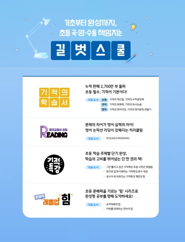 18기초부터 완성까지,초등 국·영·수를 책임지는길 벗 스 쿨대표 도서 ● 요약독해의 힘● 어휘를 정복하는 한자의 힘초등 문해력을 기르는 ‘힘’ 시리즈로완성형 공부를 향해 도약하세요!대표 도서 ● 미국교과서 READING문제의 차이가 영어 실력의 차이!영어 논픽션 리딩이 강해지는 커리큘럼대표 도서 ● 그만 틀리고 싶은 기적특강 초등 고학년 맞춤법● 원리로 쉽게 이해하는 기적특강 분수 개념● 공식이 쏙 외워지는 기적특강 평면도형초등 학습 주제별 단기 완성,학습의 고비를 뛰어넘는 단 한 권의 책!학기습적서의대표 도서 수학국어영어기적의 계산법, 기적의 수학문장제 기적의 독해력, 기적의 독서논술기적의 영어리딩, 기적의 영어문장 만들기누적 판매 2,700만 부 돌파초등 필수, 기적이 기본이다!미국교과서리딩#ddd8fbR 221G 216B 251C 16M 16Y 0K 0C 49M 64Y 0K 0C 80M 80Y 0K 0#a26aceR 162G 106B 206#573590R 87G 53B 14421 Sandoll 격동굴림22 Sandoll 격동굴림23 Rix세종로굴림_Pro논픽션 리딩에 강해지는미국교과서 리딩문제4 4의 차이가 영어 실력4 4 4 4의 차이 ! 123미국 교과 과정의 다양한 주제를 통한배경지식 & 어휘 습득논픽션 리딩의 준비부터 심화까지수준별 난이도 학습꼼꼼한 복습으로 학습 효율을 높일 수 있는온라인 퀴즈, 부가자료 제공단계별 다른 문제 유형 연습으로문제해결력 & 통합사고력 향상11 Sandoll 격동굴림22 Sandoll 격동고딕22