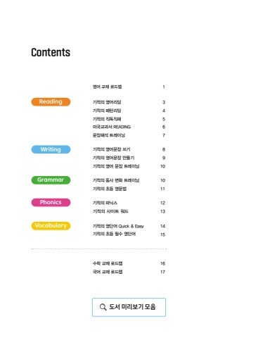 ContentsReadingWritingGrammarPhonicsVocabulary기적의 영어리딩기적의 패턴리딩기적의 직독직해미국교과서 READING문장해석 트레이닝기적의 영어문장 쓰기기적의 영어문장 만들기기적의 영어 문장 트레이닝기적의 동사 변화 트레이닝기적의 초등 영문법기적의 파닉스기적의 사이트 워드기적의 영단어 Quick & Easy기적의 초등 필수 영단어수학 교재 로드맵국어 교재 로드맵3456789101011121314151617도서 미리보기 모음 도서 미리보기 모음영어 교재 로드맵 1
