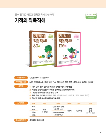 5끊어 읽기로 빠르고 정확한 독해 완성하기교사용 자료부가학습자료후속 교재 추천특장점도서 정보수업용 PDF, 교사용 PDFMP3, 단어 테스트, 끊어 읽기 연습, 딕테이션, 영작 연습, 문장 해석, 총정리 테스트문장해석 트레이닝1 의미 단위 끊어 읽기로 빠르고 정확한 직독직해 연습2 복잡한 문장의 문법과 구조를 짚어보는 Grammar Point3 다양한 장르의 흥미로운 글감 수록4 필수 단어 마스터 (80단계: 권당 160개 학습 | 120단계: 권당 200개 학습)5 단어와 지문 복습을 위한 워크북 포함기적의 직독직해단계 대상 난이도 페이지 정가 구성80A초등4~6학년Lexile 410~600LAR 2.3~4.3168쪽 16,000원본책,별책(워크북+정답)80B120A Lexile 610~800L120B AR 3.5~5.2공식 제휴